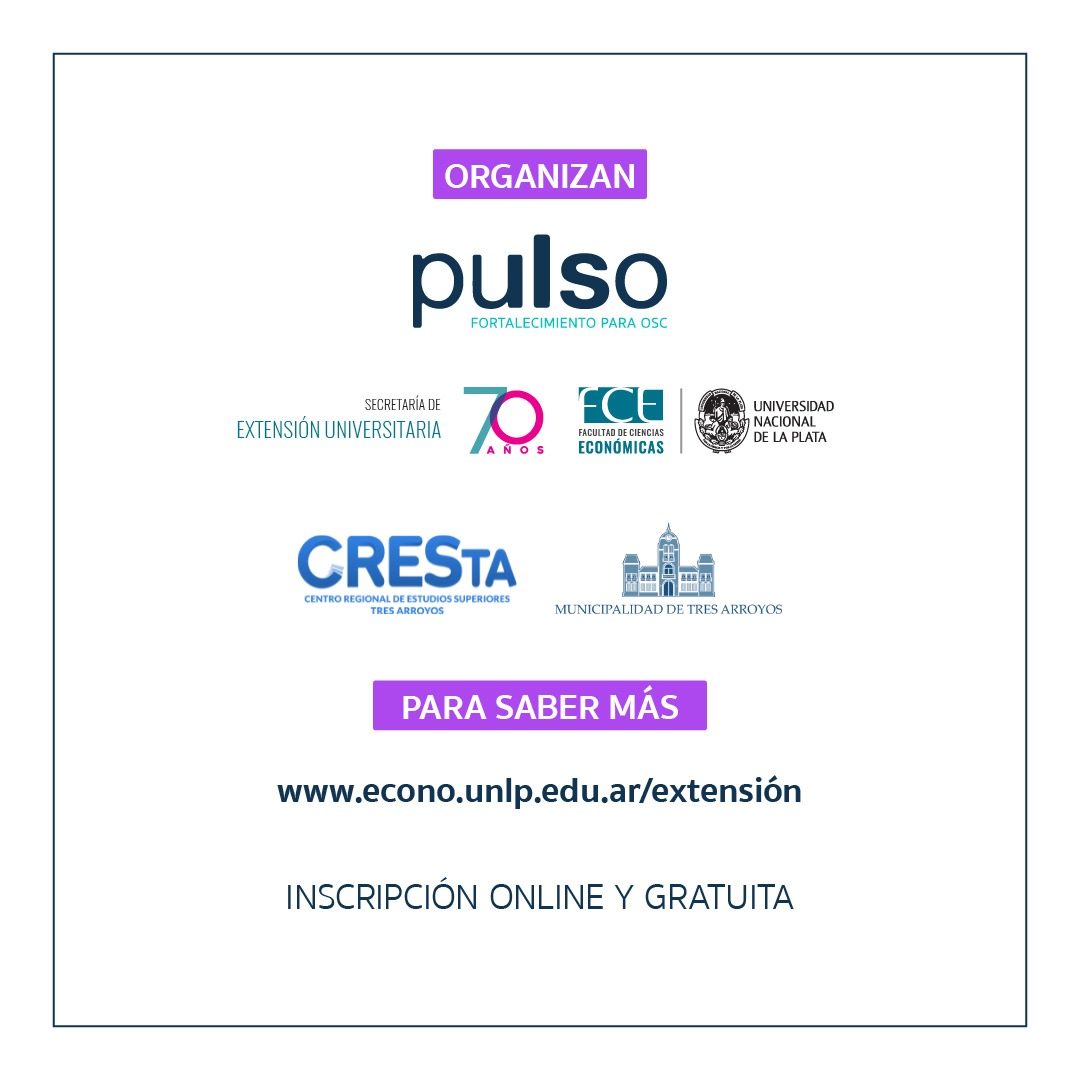 CRESTA invita a dirigentes y miembros activos de las Organizaciones de la Sociedad Civil, del distrito de Tres Arroyos, a participar de las siguientes actividades organizadas por la Secretaría de Extensión Universitaria, de la Facultad de Ciencias Económicas de la UNLP, en el marco del Programa PULSO para el Fortalecimiento para las Organizaciones de la Sociedad Civil (OSC).