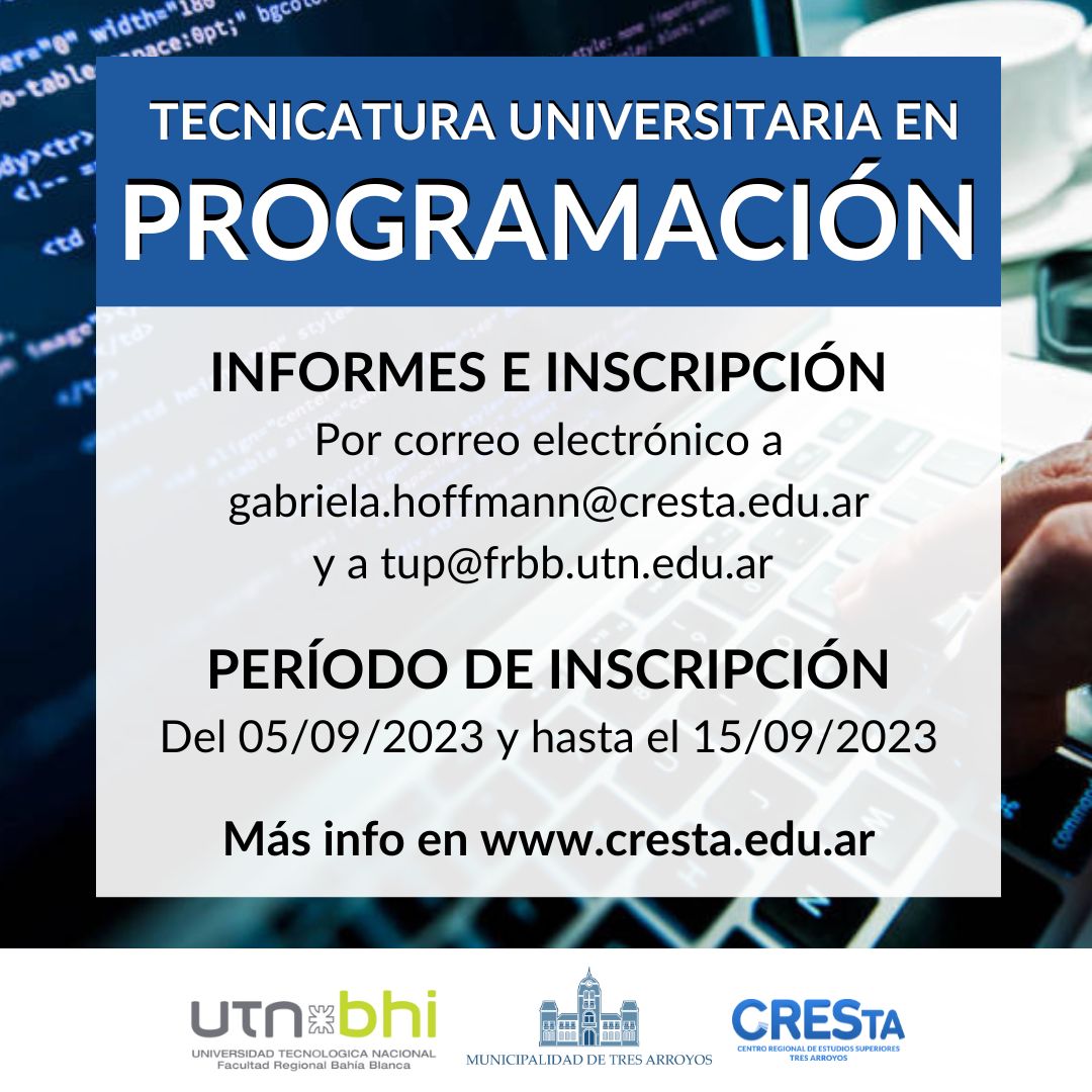 CRESTA informa que se encuentra abierta la inscripción, en la Facultad Regional Bahía Blanca de la Universidad Tecnológica Nacional, al Registro de Aspirantes para conformar el cuerpo docente de la TECNICATURA UNIVERSITARIA EN PROGRAMACIÓN (Ordenanza N° 987), a dictarse en el Centro Regional de Estudios Superiores de Tres Arroyos (CRESTA) durante 2024, 2025 y 2026. Se requieren Profesionales afines a la Informática y Programación, Contadores Públicos, Licenciados en Administración y Abogados, para cubrir los cargos de Profesor Adjunto y de Ayudante de Trabajos Prácticos, para las siguientes asignaturas cuatrimestrales: