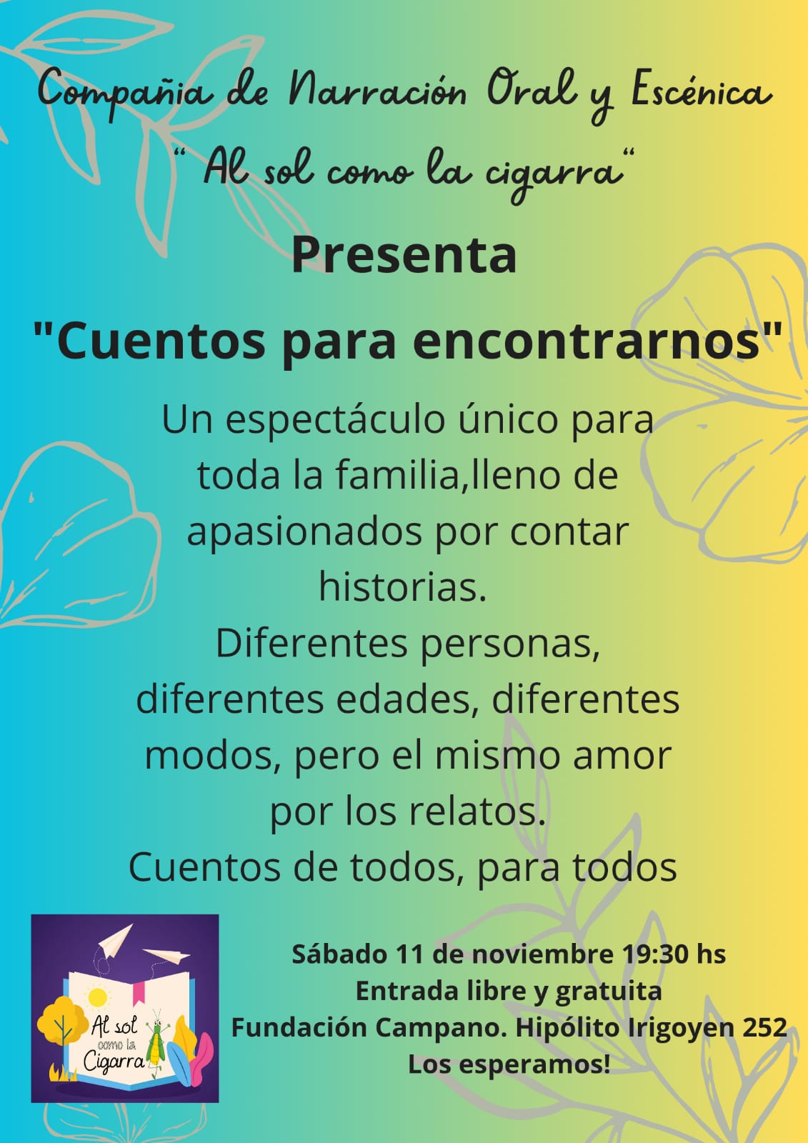 La Fundación Campano y la Compañía de Narración oral y escénica “Al sol como la cigarra” presenta “Cuentos para encontrarnos”, un espectáculo único para toda la familia, lleno de apasionados por contar historias.