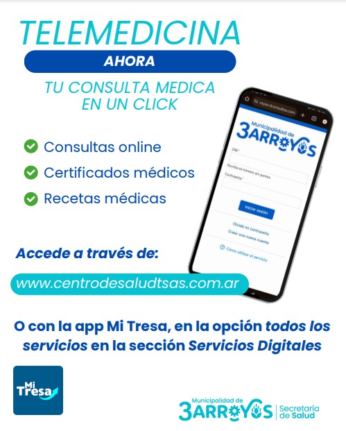 Se recuerda que pueden acceder al servicio a través de www.centrodesaludtsas.com.ar o descargando la aplicación municipal MiTresa (ingresando a la sección “Servicios digitales”)