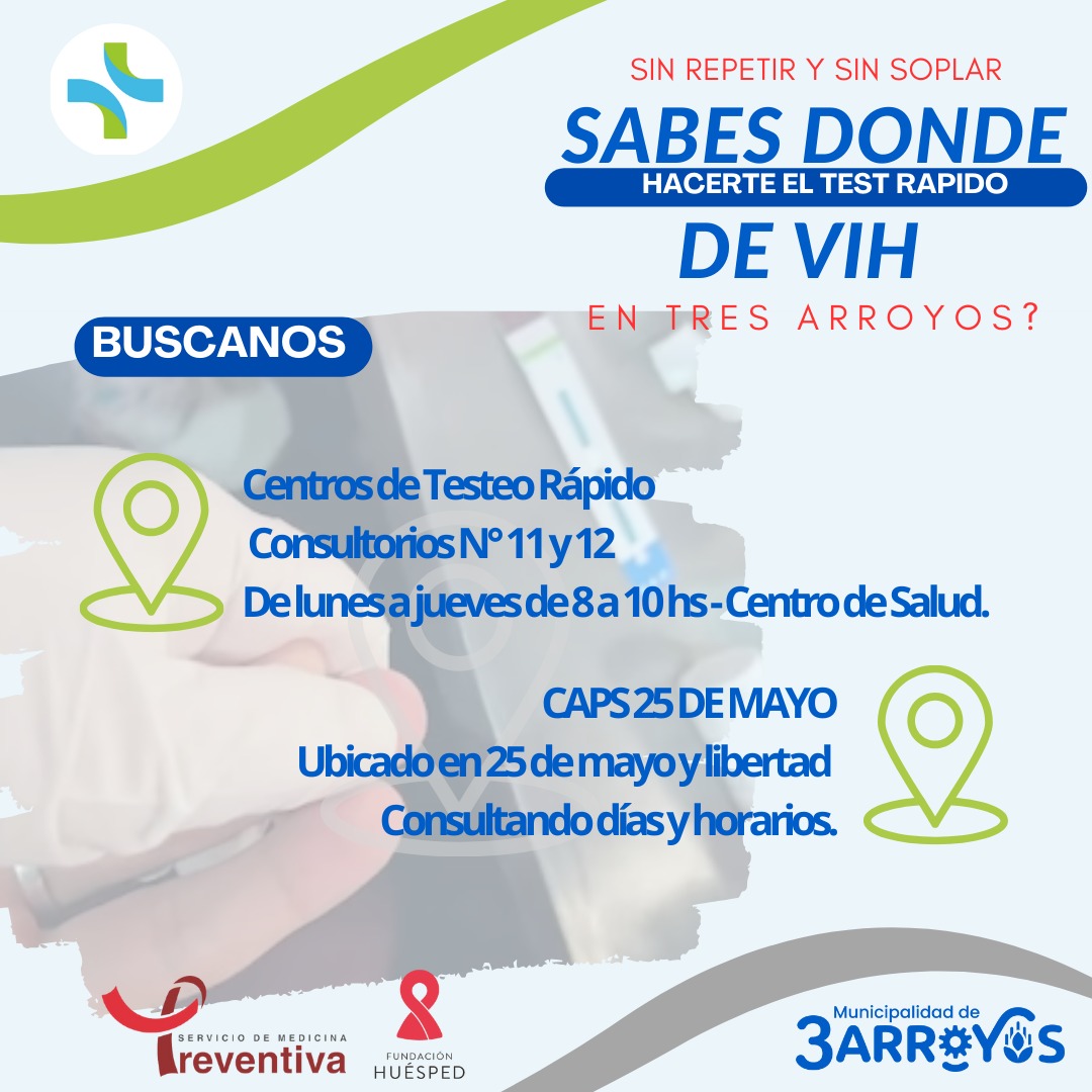 Es rápido fácil y gratuito y lo tenemos a disposición en el servicio de medicina preventiva del Centro de Salud. Necesitamos que te realices el testeo para reducir el impacto de HIV en la comunidad, indican los profesionales que trabajan en la temática, que se suman al trabajo de la Dirección de VIH- Sida de la Pcia de Buenos Aires y a la campaña de la Fundación Huésped.