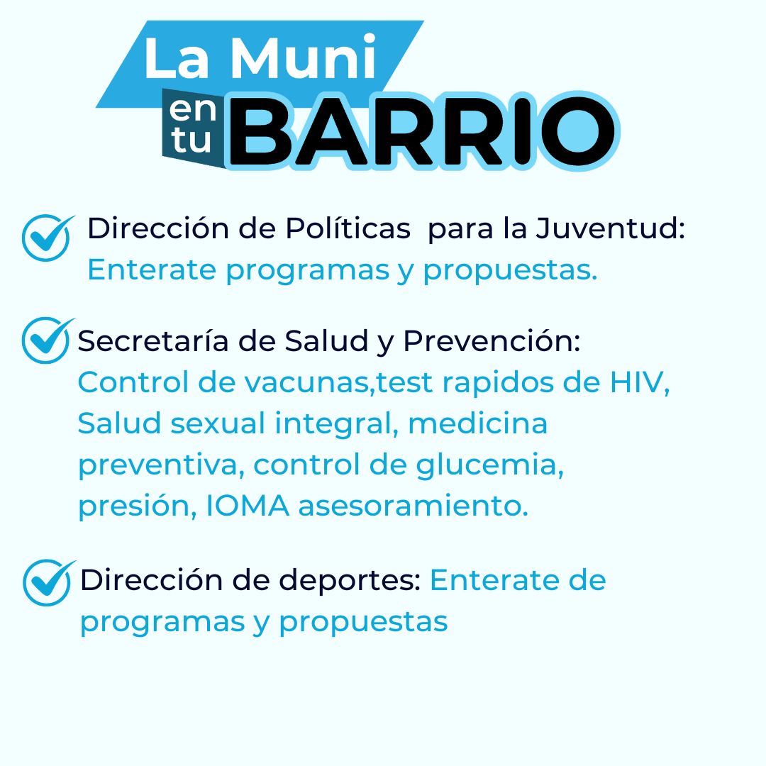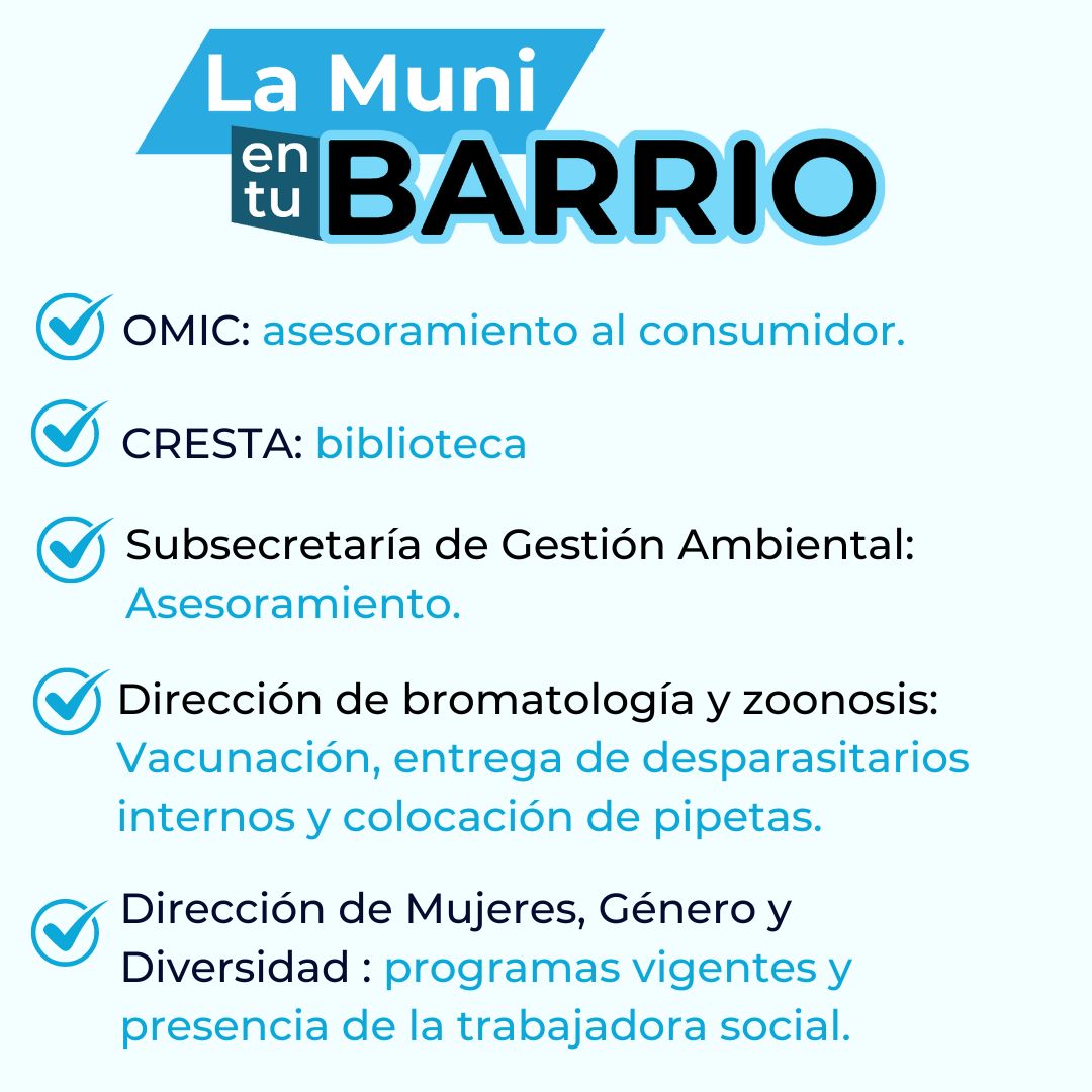 El sábado 8 de junio, de 10 a 13 hs, se realizará la segunda edición del Programa “La Muni en tu Barrio” estará presente en el Barrio La Aceitera para acercar los servicios del municipio a todos los vecinos en el predio ubicado en Garibaldi 1465.