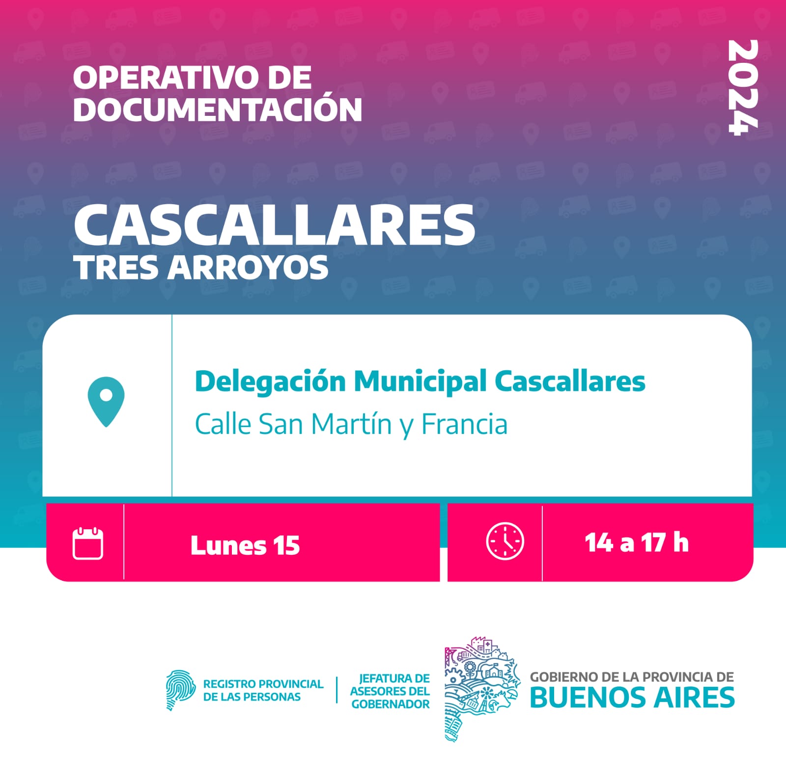 Este recorrido comenzará el lunes 15/7 en Reta en la Delegación Municipal Calle 52 y 29, en el horario de 9 a 12hs. Y Cascallares en La Delegación Municipal ubicada en San Martín y Francia por la tarde de 14 a 17hs.