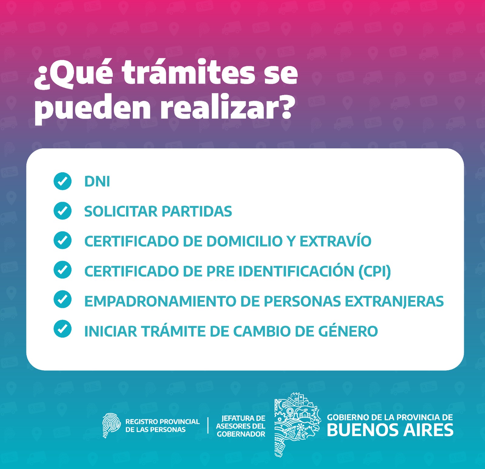 Llega a los barrios y a las localidades El Operativo de Documentación de la Provincia de Buenos Aires, que llega desde Registro Provincial de las Personas para realizar diversos trámites de forma gratuita, desde el 15 al 19 de julio; los trámites disponibles serán: