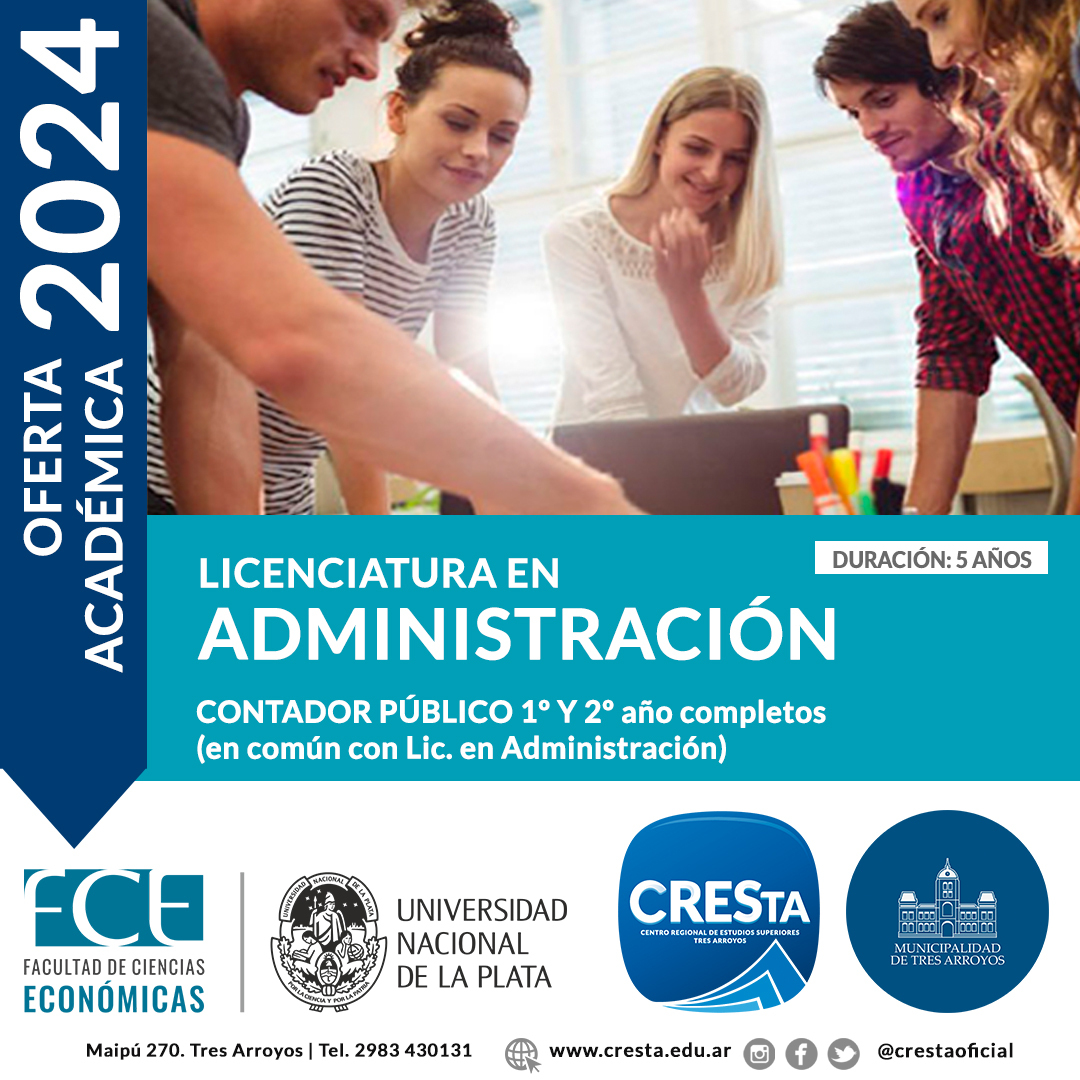 CRESTA informa que, desde el 6 de noviembre y hasta el 15 de diciembre, se encuentra abierta la inscripción a la Licenciatura en Administración de la Facultad de Ciencias Económicas de la Universidad Nacional de La Plata (UNLP), para cursar la carrera en CRESTA en 2024. La duración de la carrera es de 5 años y se cursa completa en Tres Arroyos.