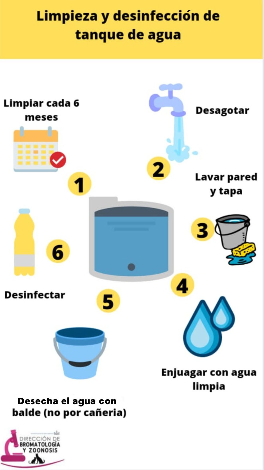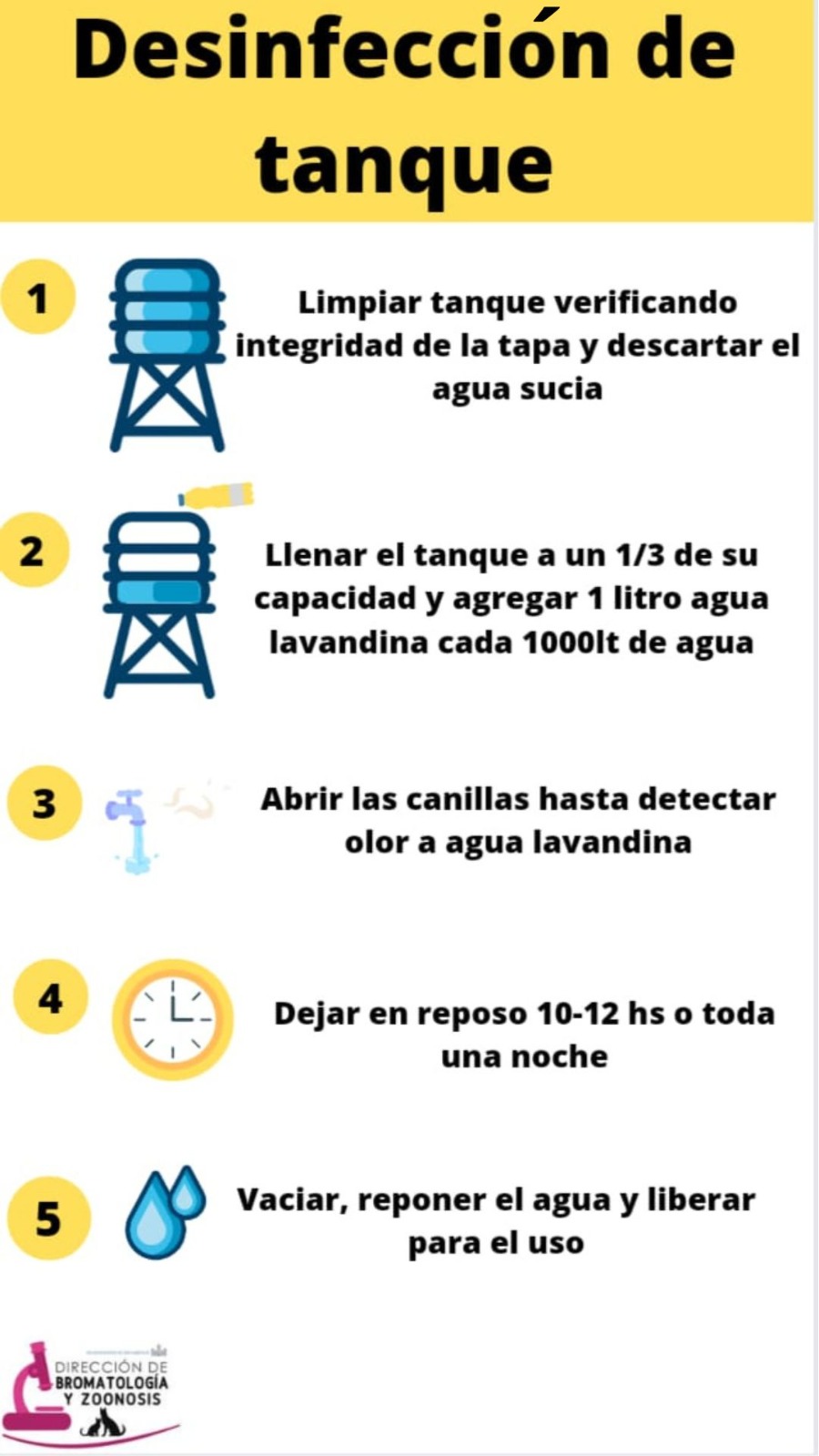 Estas acciones son fundamentales para prevenir enfermedades e infecciones causadas por el consumo de agua contaminada. Les pedimos que las realicen lo antes posible y que se comuniquen con la oficina de la Dirección de Bromatología y Zoonosis si tienen alguna duda o consulta al respecto. También les sugerimos que revisen el estado de sus tanques al menos cada 6 meses y que los limpien y desinfecten al menos una vez al año.