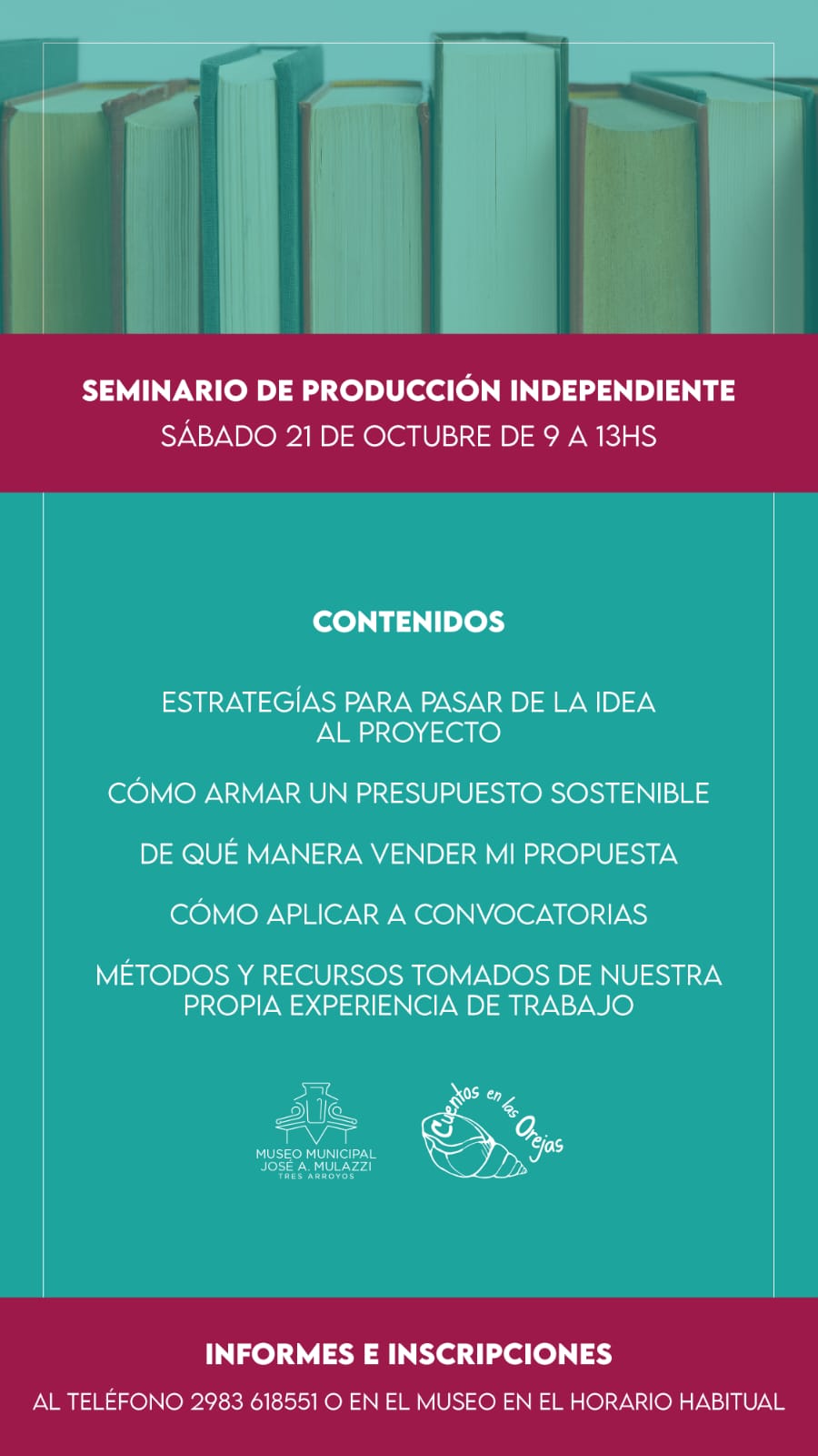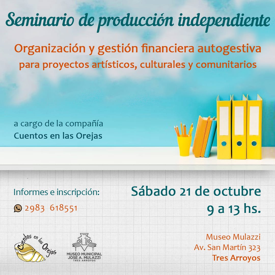 La Compañía Cuentos en las Orejas visitará la ciudad de Tres Arroyos para dictar un “Seminario de producción independiente”, será el sábado 21 de octubre, de 9 a 13 hs. en el Museo Mulazzi. La propuesta pretende compartir estrategias de organización y gestión autogestiva, para pasar de la idea al proyecto y poder sostenerlo a través del tiempo.